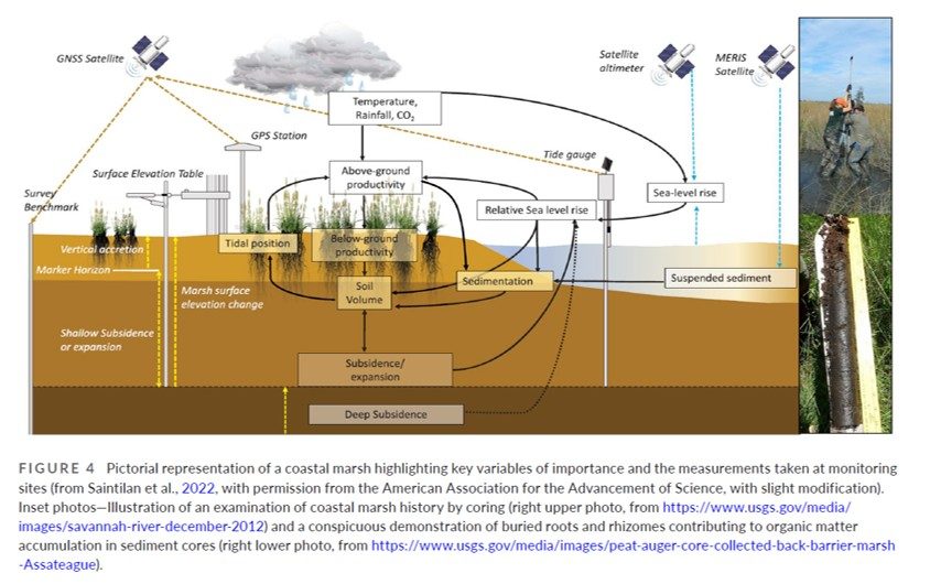 Rising sea levels threaten coastal areas around the world. It is known that coastal wetlands are able to maintain their elevations in the presence of rising water levels and subsiding land processes up to some maximum rate. There has been sustained interest in this process with a desire to predict when rates of sea-level rise will exceed ecological tolerances. Scientists understand this process to involve a number of linked causal processes, which has now been explicitly documented.