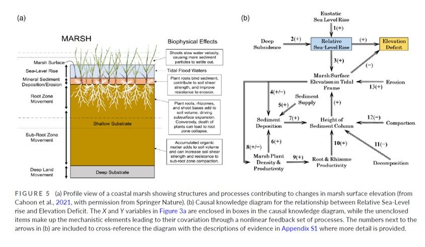Figure 10.2. (left) Depiction of structures and processes controlling wetland surface elevation change. (right) causal knowledge diagram depicting documented causal process.