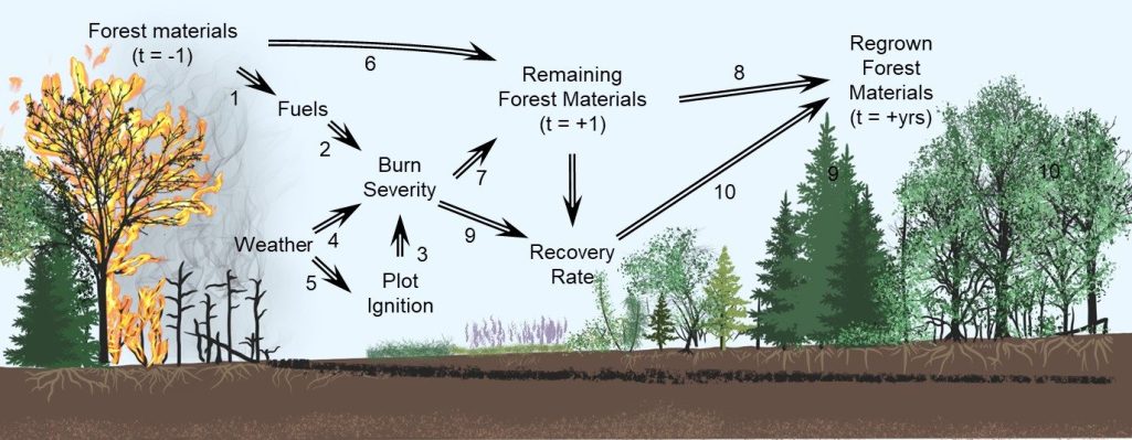 Figure 4.5. A depiction of the structural elements and how they are known to change over time was developed and overlaid with a Causal Knowledge Diagram. Double line arrows are used to denote that this is a representation of causal knowledge, not statistical connections (this is not DAG, path diagram, or any other representation of data associations). Documentation for the numbered mechanistic links are reported in the full paper. These links are ultimately supportable at the level of physics, biology, and soil chemistry.