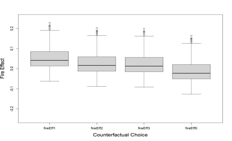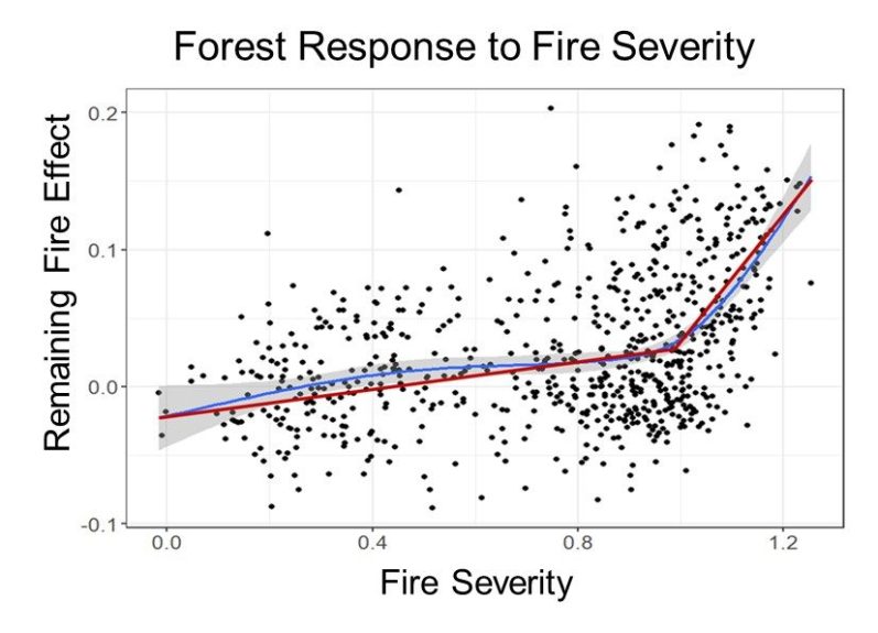 Figure 4.6. With support from existing mechanistic causal knowledge, it was possible to estimate the shape of response to the severity of fire at each sample point, revealing a threshold. Further analyses showed that the response form was stable, independent of counterfactual choice, and transportable to other situations.