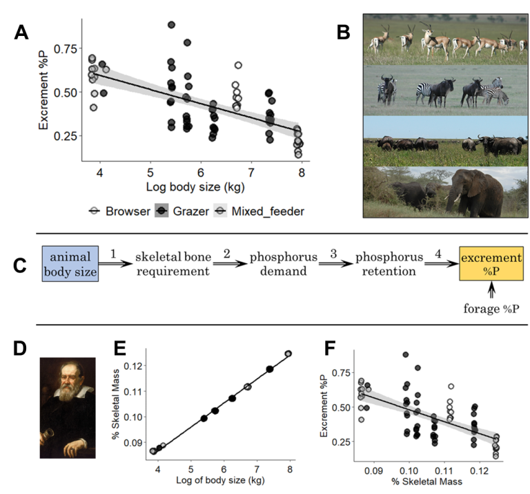 (A) Reported relationship between the phosphorus content of feces as a function of animal body size for herbivores in African savannas (28).