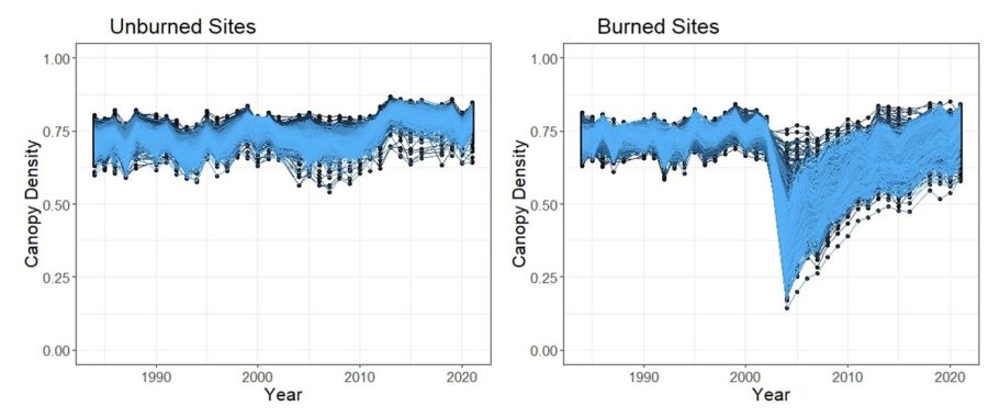 Figure 4.4. Counterfactual causal inference techniques were used to calculate causal effects using a variety of counterfactual assumptions. All choices were in agreement that forest cover recovered completely 22 years following fire.