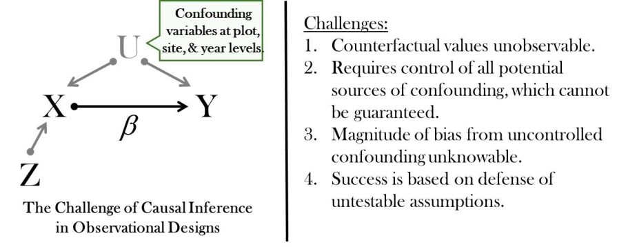 Figure 6.2. Representation of the challenge of statistical causal inference in observational data (modified from Dee et al. 2023). The theoretical requirement is to obtain a perfectly unbiased estimate of the effect of X on Y, β. Confounding variables U pose a pervasive threat to that goal that must be addressed. Z refers to an alternative method for bias control using instrumental variables.